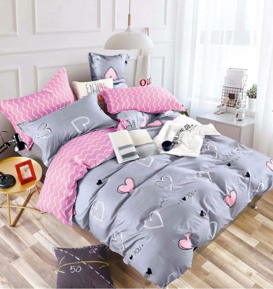 Posteljnina 160x200, 3 delna, roza in siva s srčki